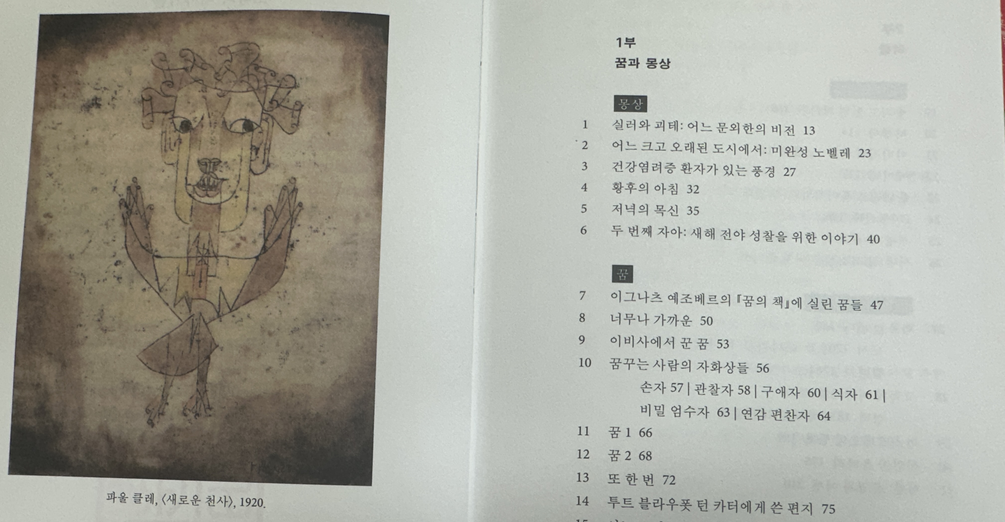 오히려 내 시선을 머물게 한 것은 글들보다 책 곳곳에 삽화로 실어놓은 파울 클레의 작품들이다. 발터벤야민은 파울클레의 작품에 대한 애정이 대단했다. 단순하고 유머러스하며 공상적인 클레의 그림에 벤야민은 이야기를 더해 활기를 불어넣었다. 『고독의 이야기들』의 첫 페이지에 나오는 파울 쿨레의 작품 <새로운 천사(Angelus Novus)> 는 특히 그러하다. 1921년 발터 벤야민은 <새로운 천사>를 직접 구입했다. 이 그림은 그의 최고가 소유물이 되었다. 벤야민이 미국 망명길에 올라 좁혀오는 나치의 추적을 피해 스페인의 국경에 이르러 죽음을 맞이할 때까지 이 그림을 품에 간직했다고 한다. 『고독의 이야기들』에는 파울 클레를 소개하며 발터 벤야민이 <새로운 천사>에 대해 평해놓은 글을 실어 놓았다. 이 그림은 제2차 세계 대전 후, 벤야민의 평생 친구인 게르솜 숄렘(1897-1982)의 손을 거쳐 현재 이스라엘 국립박물관이 소장하고 있다.